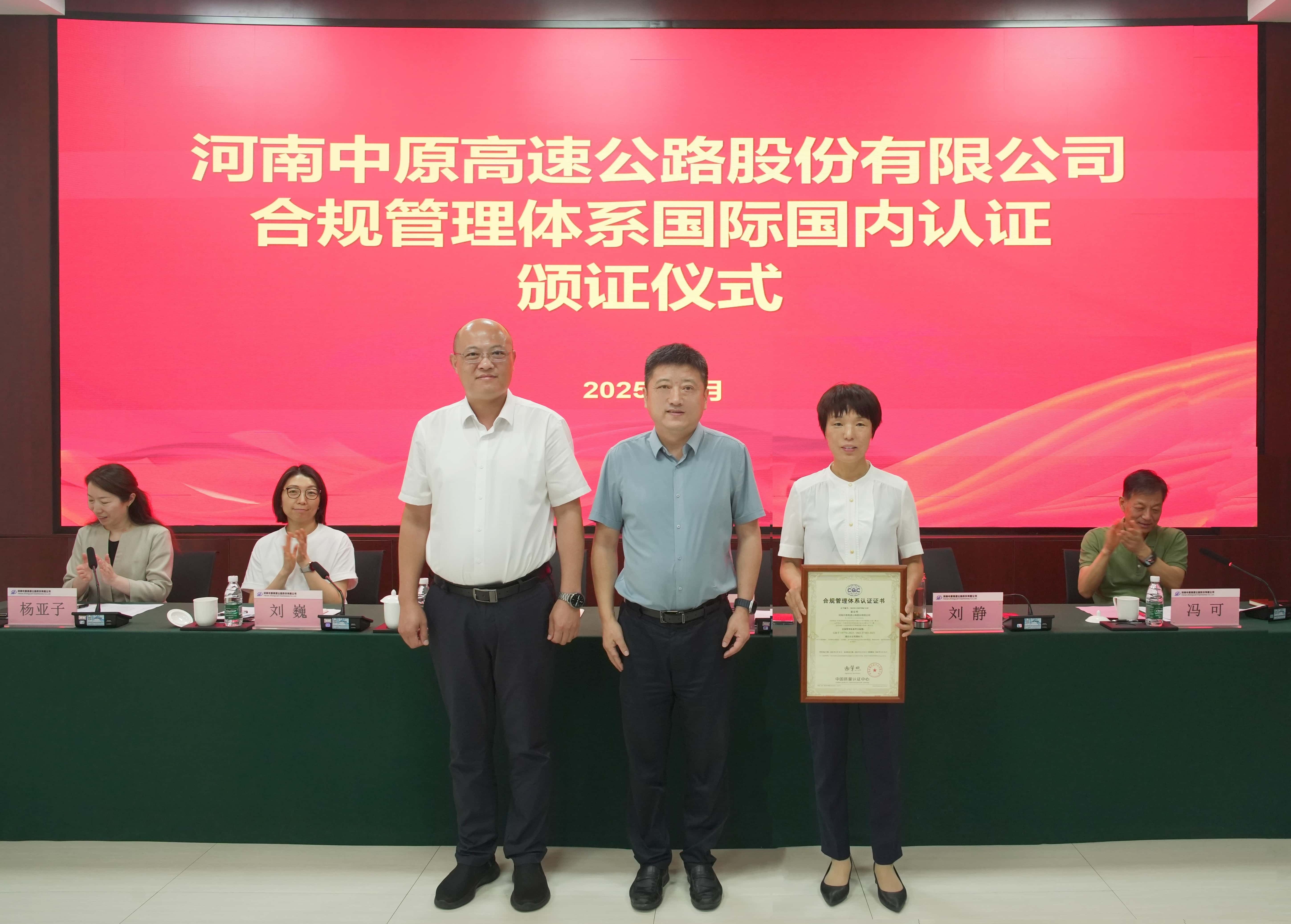 集團黨委委員、副總經理袁凍雷參加中原高速合規(guī)“雙認證”頒證儀式并專題聽取科創工作匯報